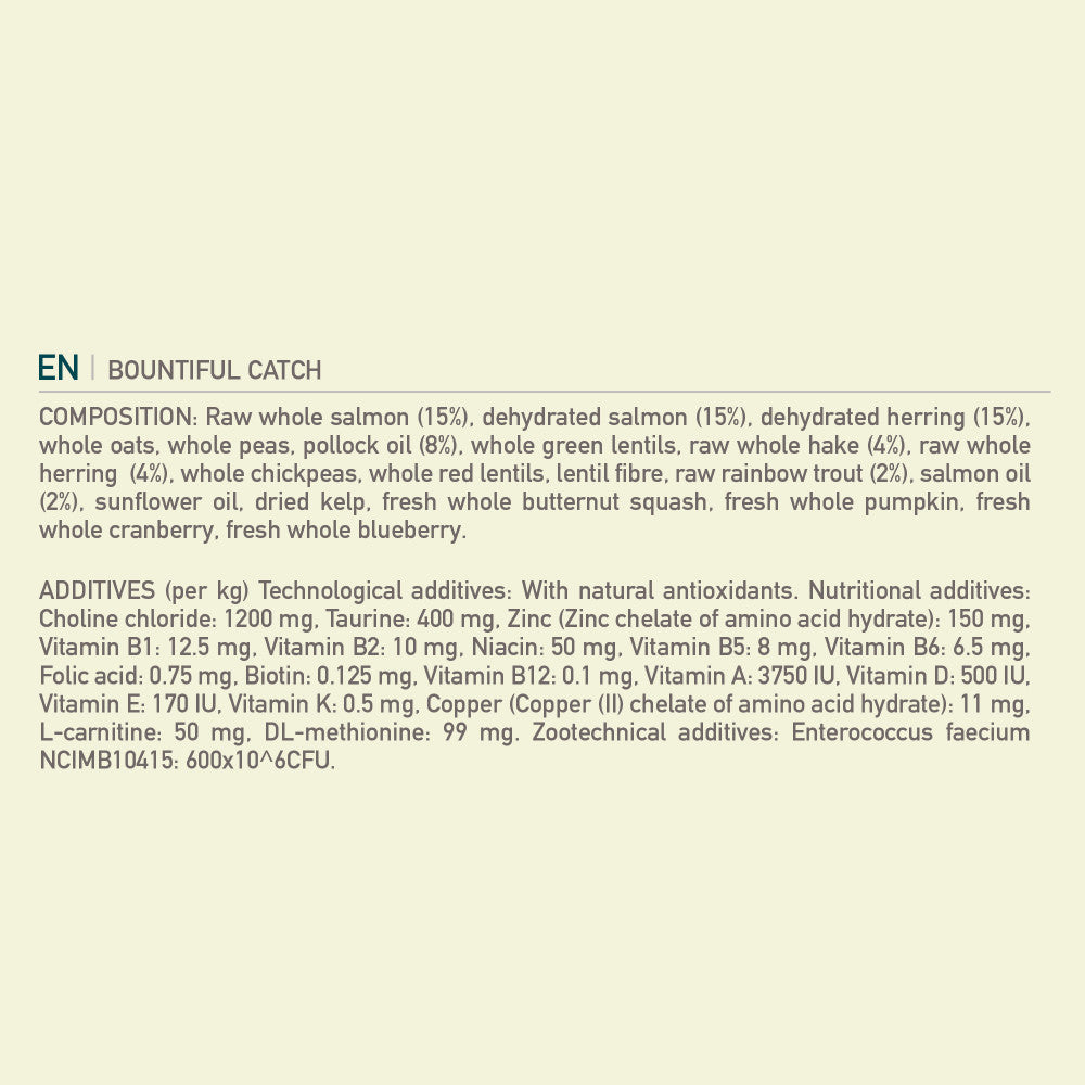 Specially crafted with a bounty of fish, our ACANA™ Bountiful Catch Recipe satisfies your cat with rich fish ingredients. Rich with 65% quality animal ingredients* including raw salmon and whole herring, Bountiful Catch has the animal protein your cat needs to be their best. This nutrient-dense recipe also helps support key health benefits for your cat, including healthy skin & coat, healthy heart & eyes and digestive health. Nurture your feline with a fish-forward recipe tailored to keep them healthy and happy with ACANA Bountiful Catch! *Approximate and derived from the unprocessed state of the ingredients. Our raw ingredients are frozen at their peak freshness.