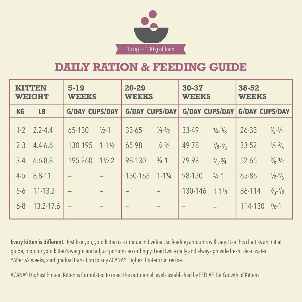 Nurture your growing kitten with more animal protein in ACANA™ Highest Protein Kitten recipe. Perfect for kittens up to 12 months old, this premium recipe is crafted with 75% protein-rich animal ingredients* including free-run** chicken, turkey, salmon, and no grain ingredients*** to satisfy and nourish your young feline. Our nutritious ingredients also help support the growth and development of your kitten, including healthy skin & coat, healthy heart & eyes and digestive health. See your kitten grow up healthy and strong with protein-rich recipe crafted specially for their needs. *Approximate and derived from the unprocessed state of the ingredients. **Our free-run chickens and turkeys are not housed in cages and are able to move in a barn without outdoor access.