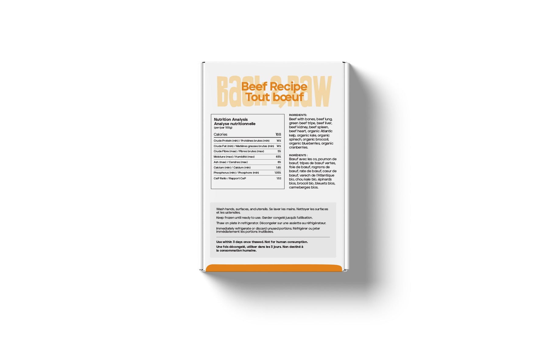 Beef with bones, beef lung, green beef tripe, beef liver, beef kidney, beef spleen, beef heart, organic kelp, organic kale, organic spinach, organic broccoli, organic blueberries, organic cranberries