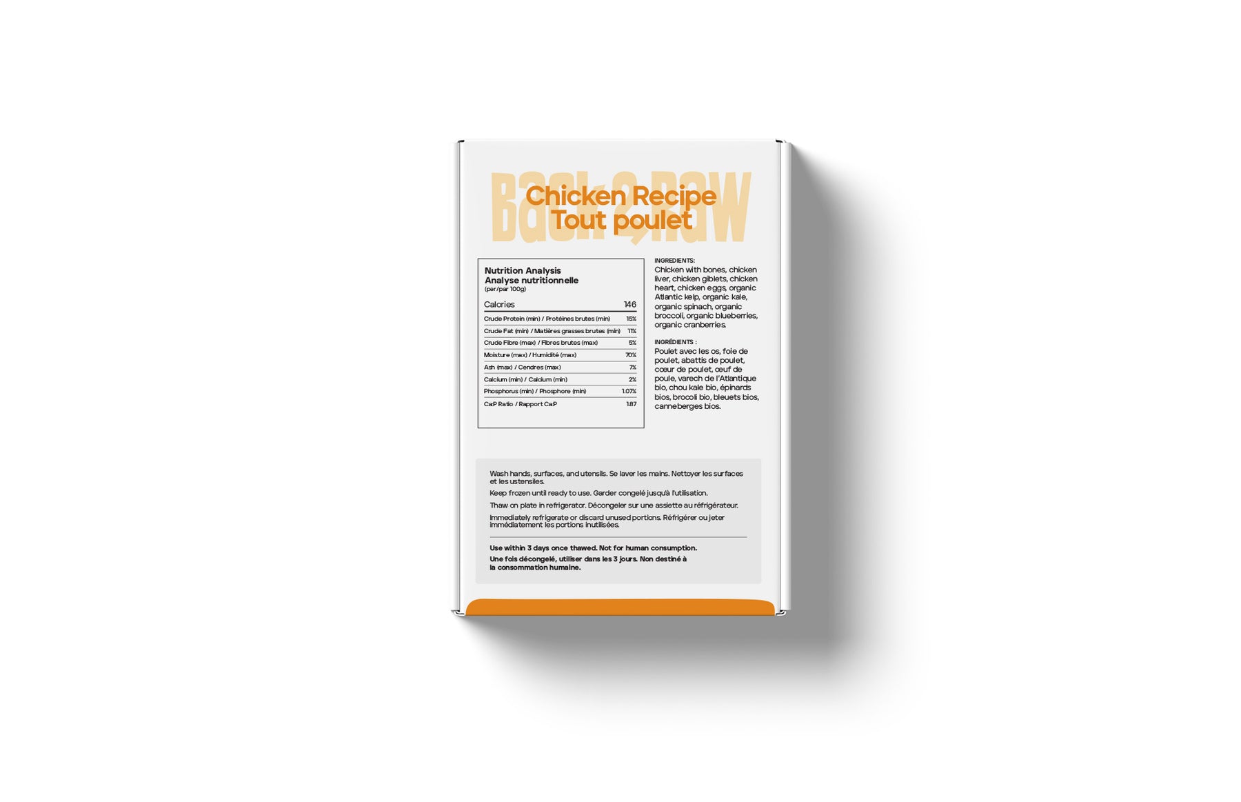 Chicken with bones, beef lung, green beef tripe, beef liver, beef kidney, beef spleen, beef heart, chicken eggs, organic Atlantic kelp, organic kale, organic spinach, organic broccoli, organic blueberries, organic cranberries