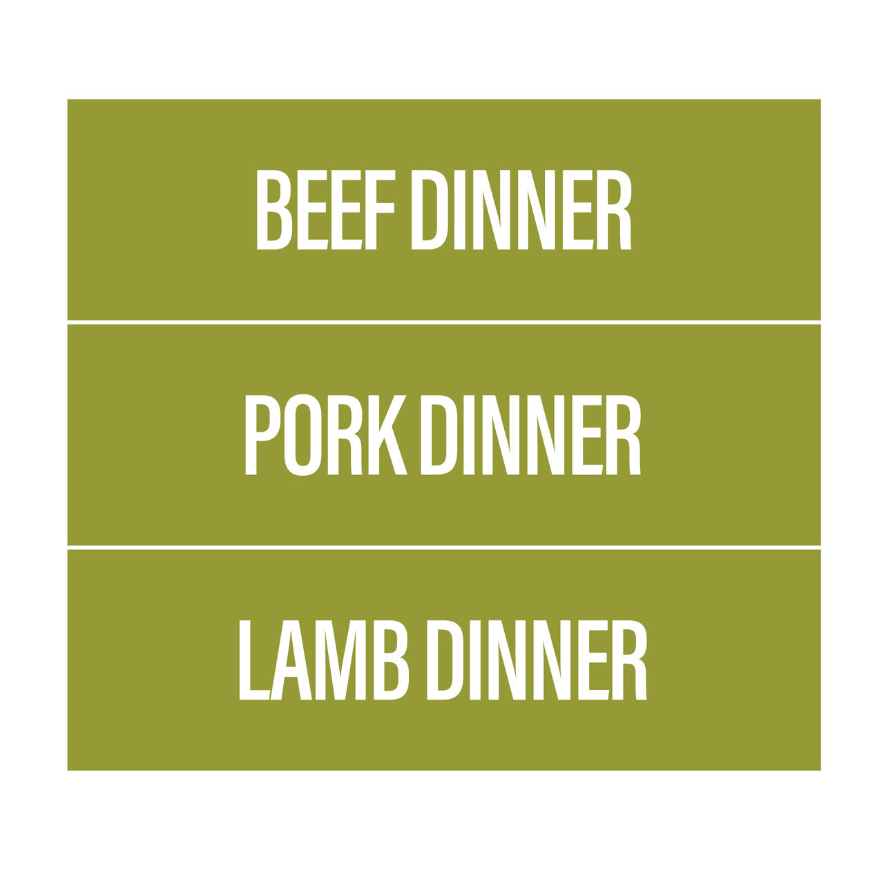 Contains 4lbs each: Beef Dinner, Pork Dinner and Lamb Dinner