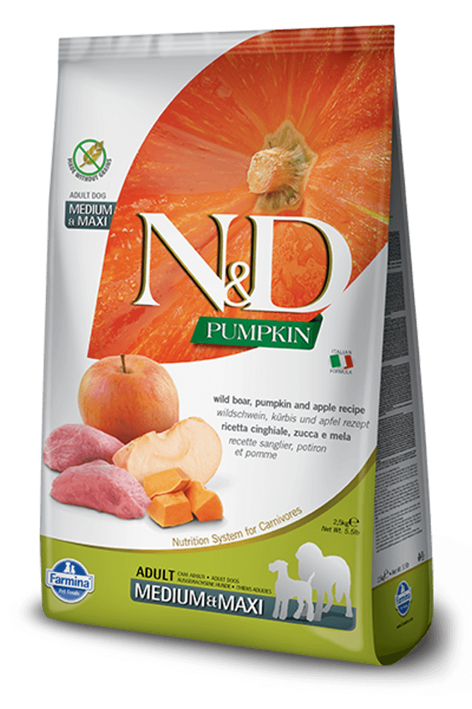 Farmina Natural & Delicious Pumpkin Canine Adult Medium & Maxi Dog Food Formula is a balanced and complete meal for adult medium and large sized dog breeds. Grain, gluten and GMO-free with no artificial preservatives. Each batch is made and packed in a protective atmosphere, that preserves the goodness of the kibble for long periods of time using nitrogen gas to replace the air in every bag of food, the same technique used in the packaging of human food. Made in Italy.